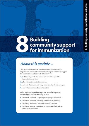 This is the last module of a pack of 8 modules on immunisation developed by the World Health Organization (WHO). It describes the process of how to gain community support for immunisation and how to make the service responsive to community needs. The module details how to:
