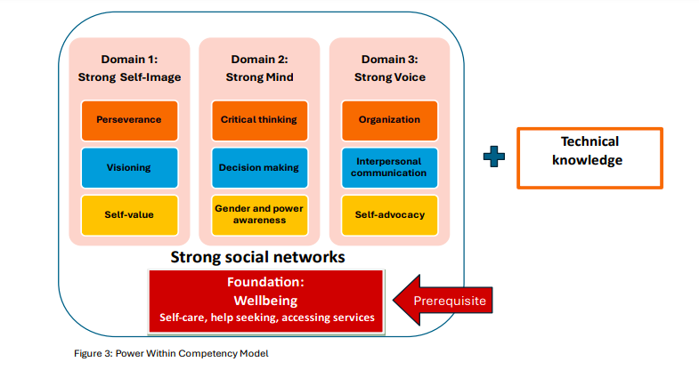 This publication outlines the Power Within (PW) Competency Framework for Adolescents and Youth developed and refined by CARE International to support young people's (ages 10-24) development by building life skills that help them deal with the challenges and demands of their daily lives. The PW competency model contains three primary competency domains - strong self-image, strong mind, and strong voice - which are each achieved by building a subset of competencies or skills such as perseverance, critical thinking, and interpersonal communication skills. The competency framework, which has been implemented by CARE since 2008, underwent a review process between 2022 and 2024 that led to key recommendations and updates to the model. It is this updated competency model that is presented in this publication.